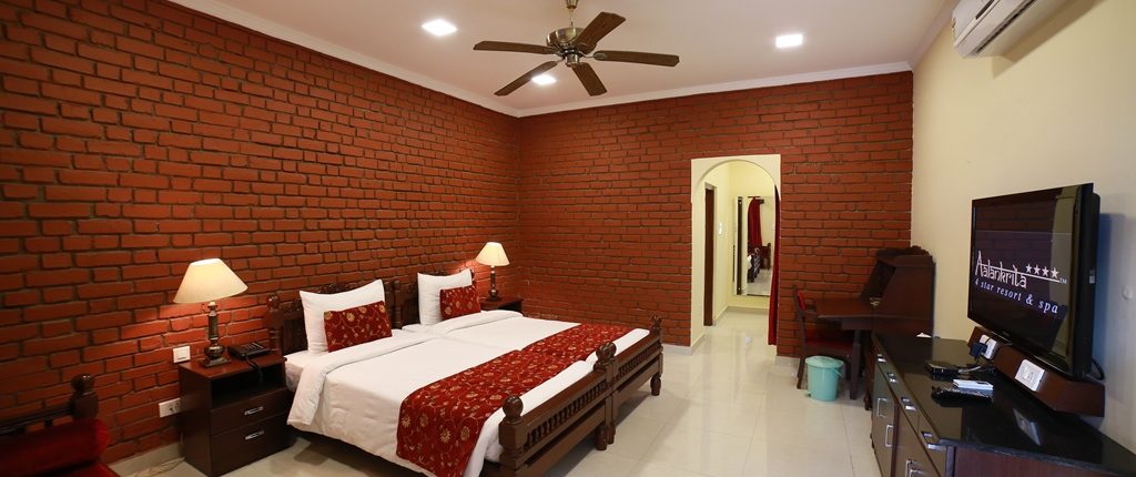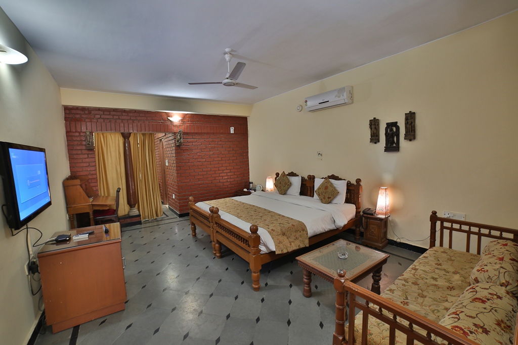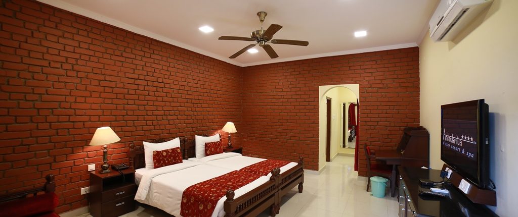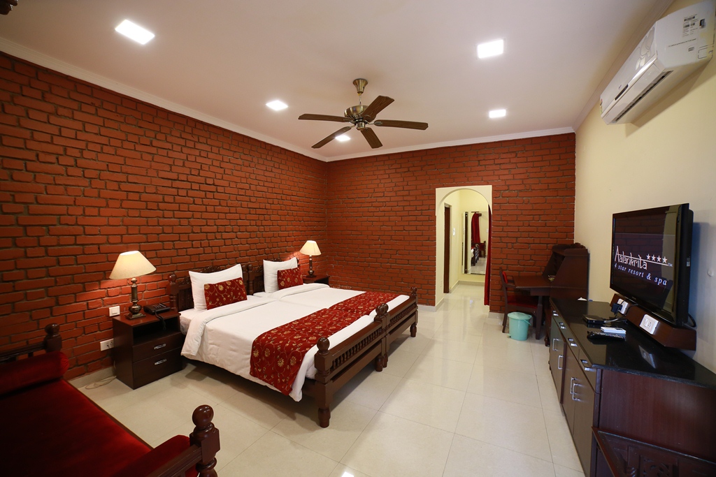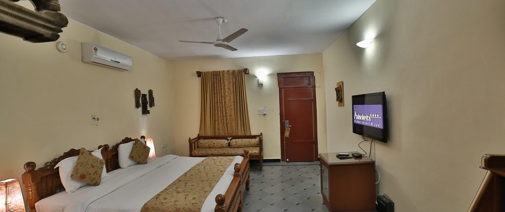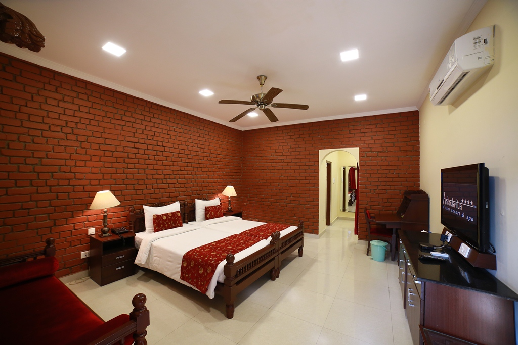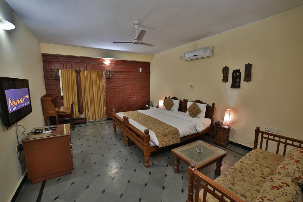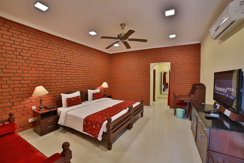Inspired by the works of Indian artisans, the Studio Cottages rediscover architectural ingenuity of days gone by. The rooms are artfully decorated and furnished with ethnic elements, and feature a private dressing area, a writing desk and a lovely sitting area. Built into the secluded charms of nature, the cottages also have a private portico with seating, for you to indulge in the surrounding serenity. The cottages are at a walking distance from the pool and all the restaurants within the resort.